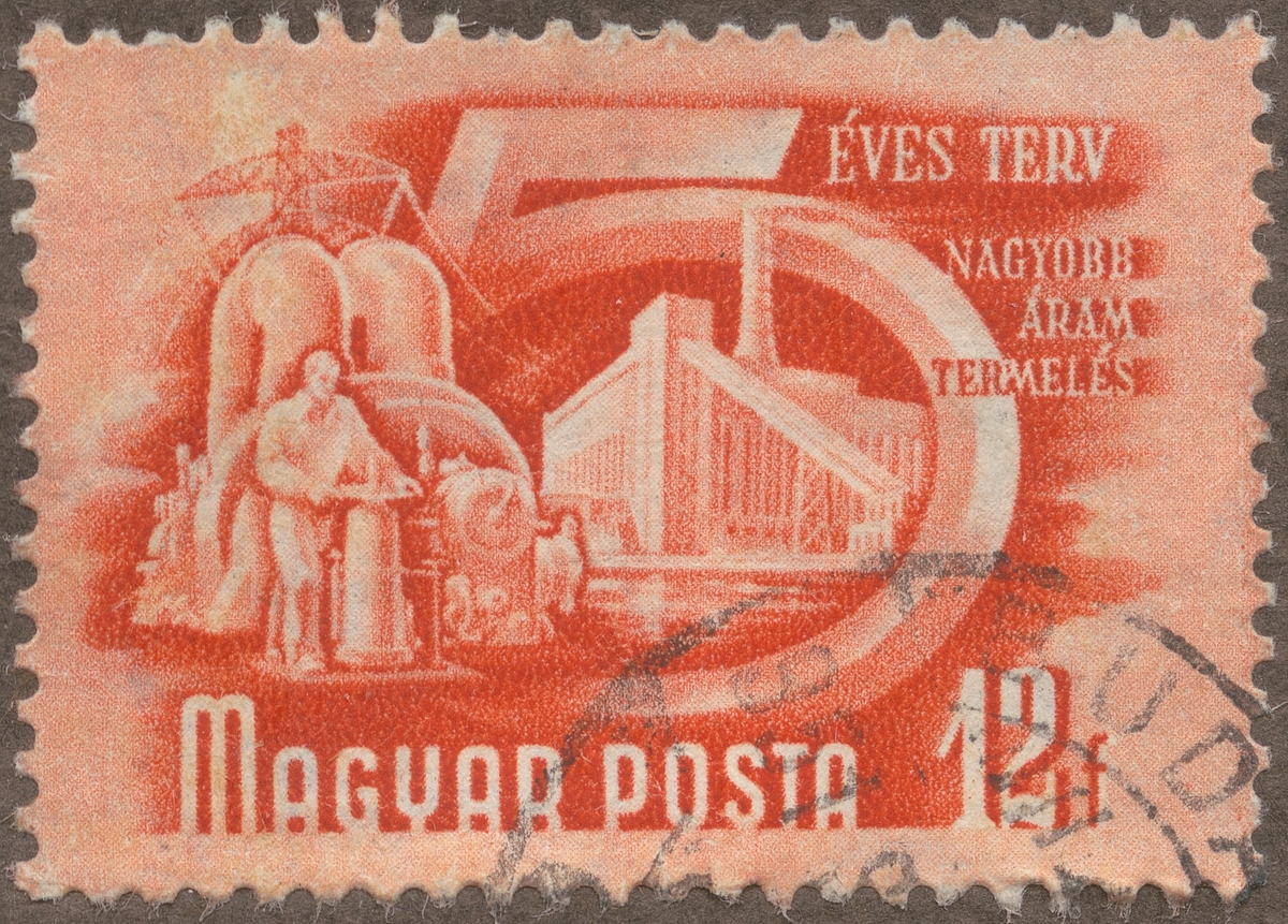 Frimärke ur Gösta Bodmans filatelistiska motivsamling, påbörjad 1950. Frimärke från Ungern, 1950. Motiv av Ungersk hydro-elektrisk central. "Propaganda för en ny femårsplan."