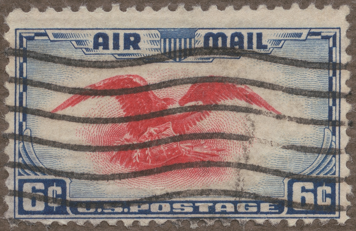 Frimärke från U.S.A., 1938. Motiv av Den amerikanska örn, gripande vapen, olivkvist och pilar. Symbol för flygpost.