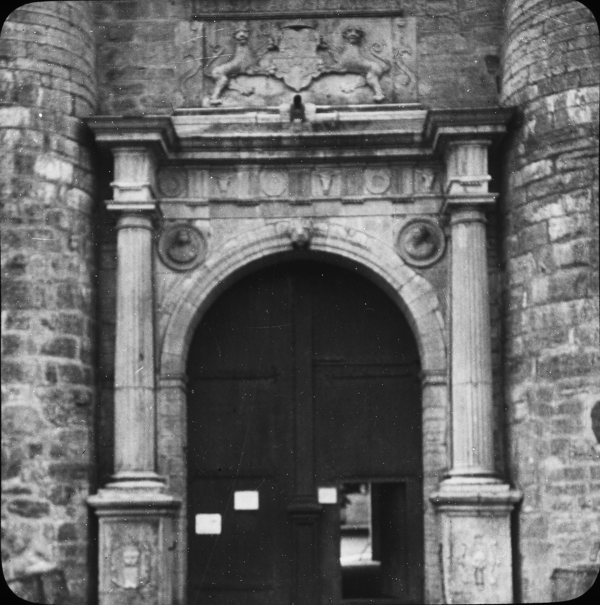 Skioptikonbild med motiv av okänd port i Vadstena. Möjligen till Vadstena Slott.