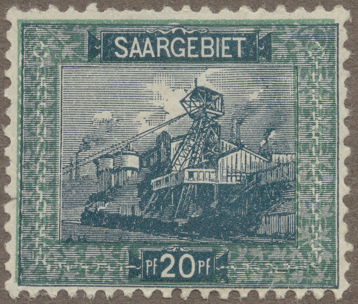Frimärke från Saar, 1921. Motiv av Koltransporttorn i Saar: Redengruvan