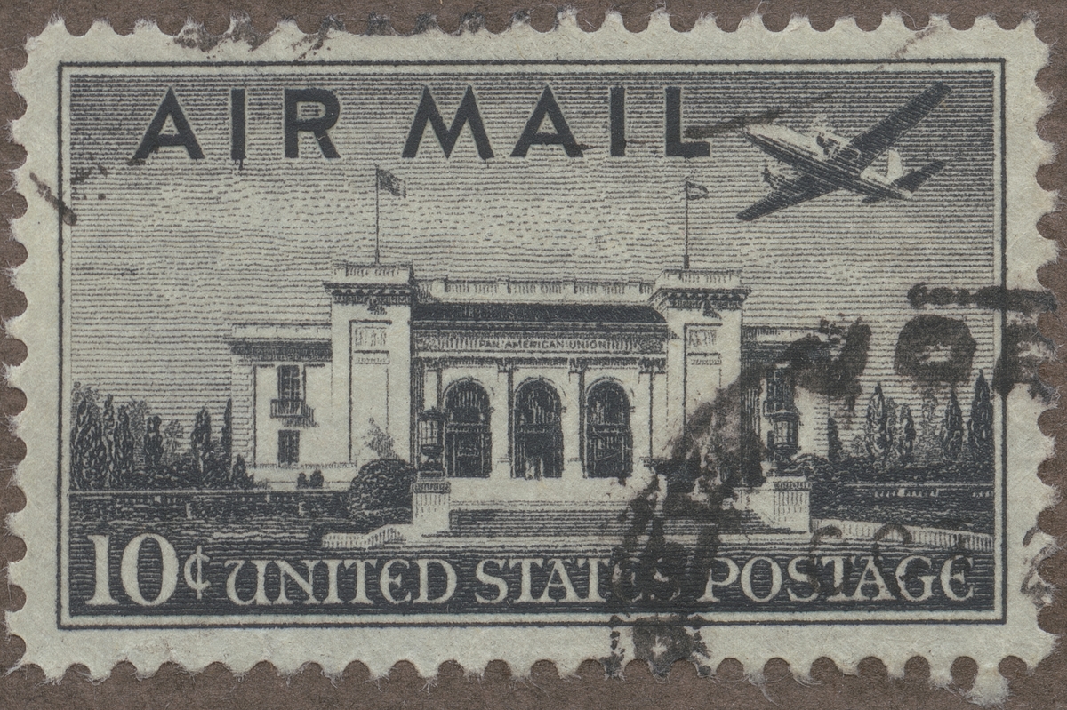 Frimärke från U.S.A., 1947. Motiv av Tvåmotorigt monoplan över "Pan-American Union" byggnaden i Washington, D.C:" Luftpost.