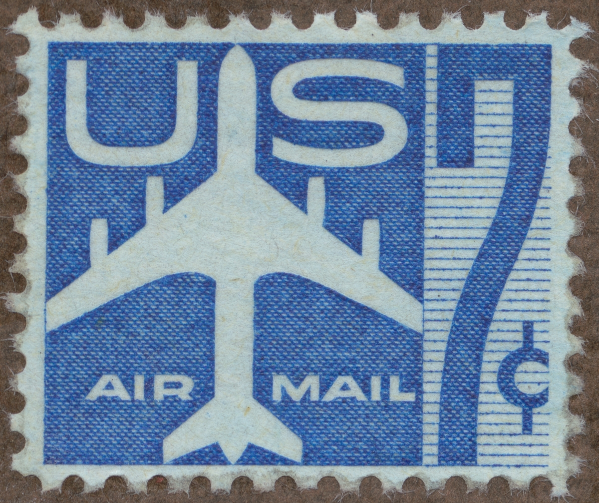 Frimärke från U.S.A., 1958. Motiv av stiliserad Fyrmotorigt monoplan av typ: "Jet airliner" - Luftpost.