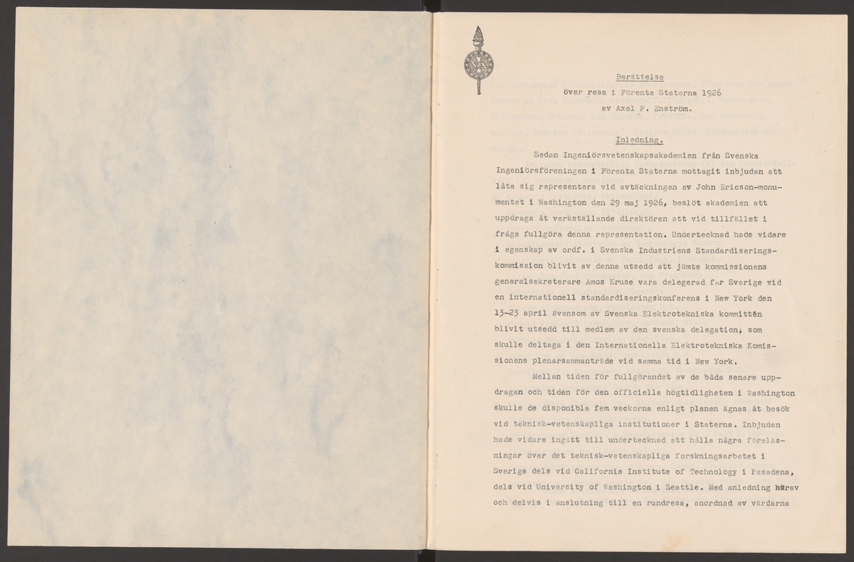 Manuskript. Berättelse över resa i Förenta Staterna 1926.