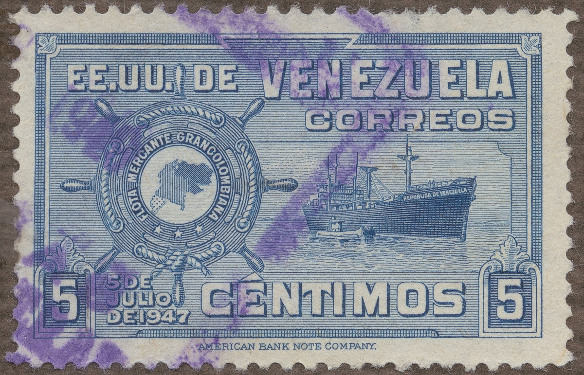 Frimärke från Venezuela, 1948. Motiv av Lastfartyg och Styrratt M/S Republica de Venezuela: s jungfruresa 5 juli 1947. "-Serie: Venezuelas handelsflotta-"