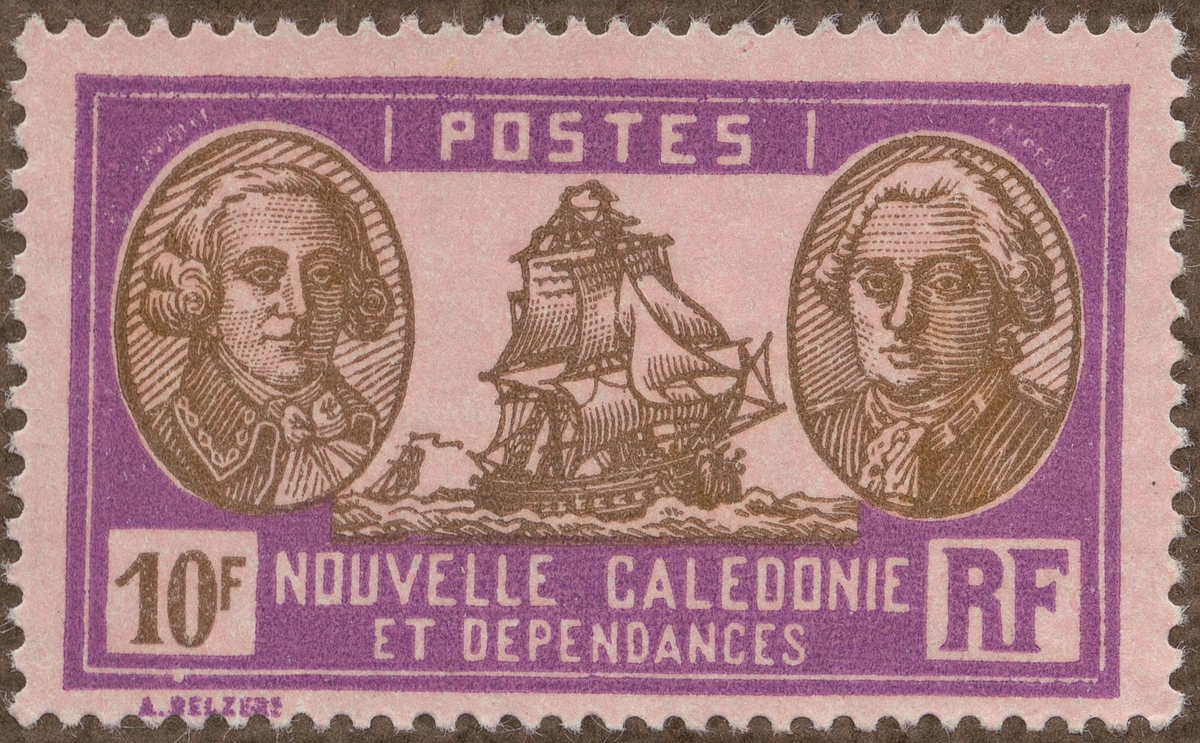 Frimärke från Nya Caledonien, 1928. Motiv av Fullriggare. t.v. Amiral Louis Antoine de Bougainville: (1729-1811) Första franska världsomseglaren 1766-1769.