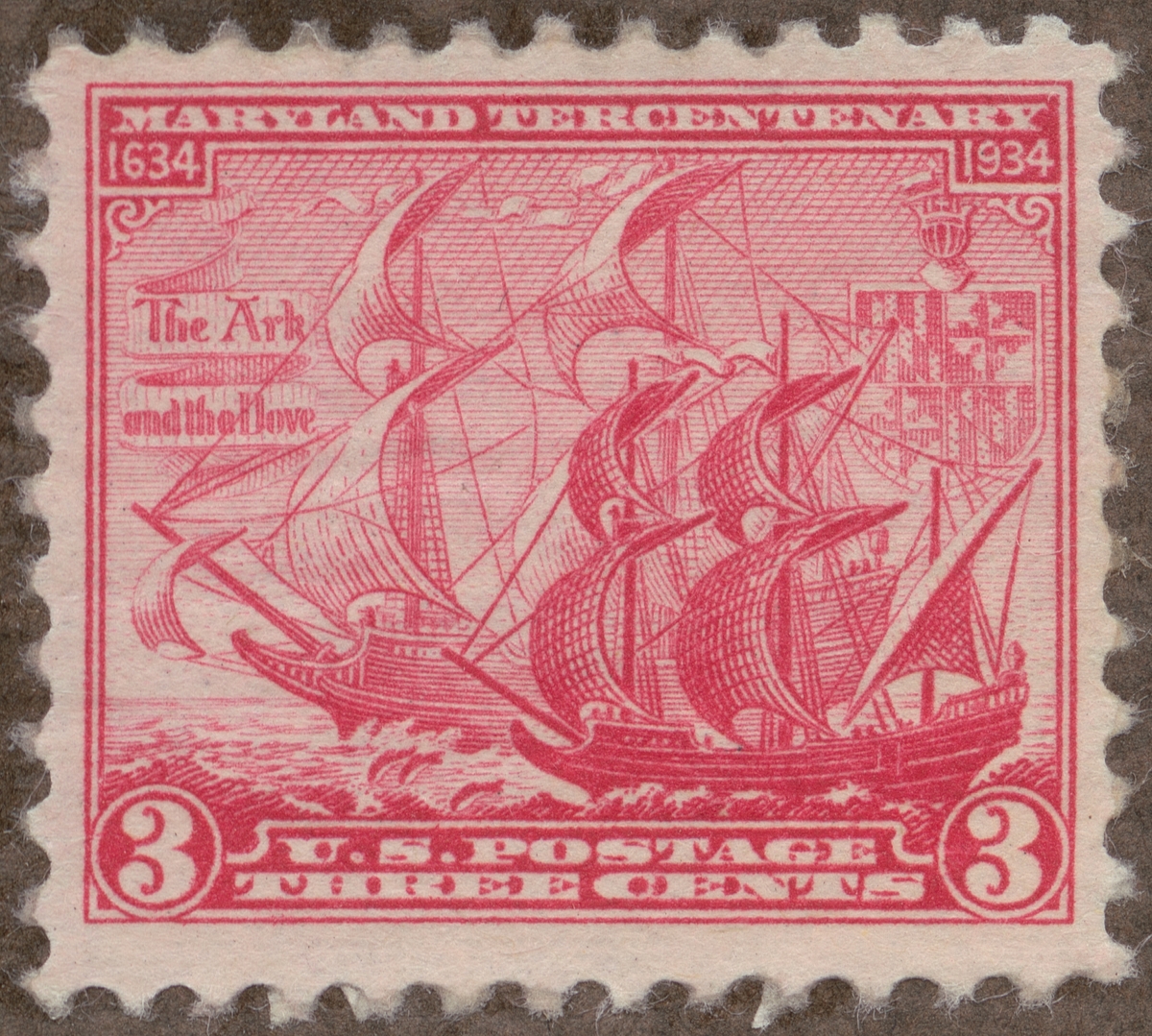 Frimärke från U.S.A., 1934. Motiv av Emigrant segelfartygen: "The Ark" och "The Dove": 300-årsminne av staten Marylands kolonisation: 1634-1934. (t.h.). Marylands vapen.