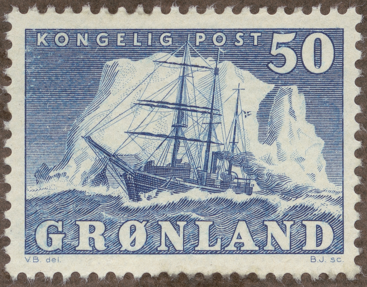 Frimärke från Grönland, 1950. Motiv av Havsforskningsfartyget "Gustav Holm" mot ett isberg som bakgrund