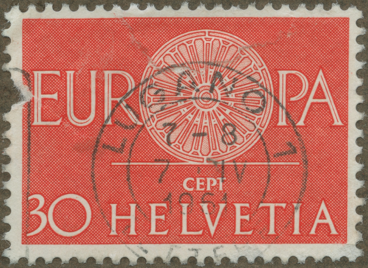 Frimärke ur Gösta Bodmans filatelistiska motivsamling, påbörjad 1950. Frimärke från Schweiz, 1960. Motiv av "Symbol för europeisk samarbete".