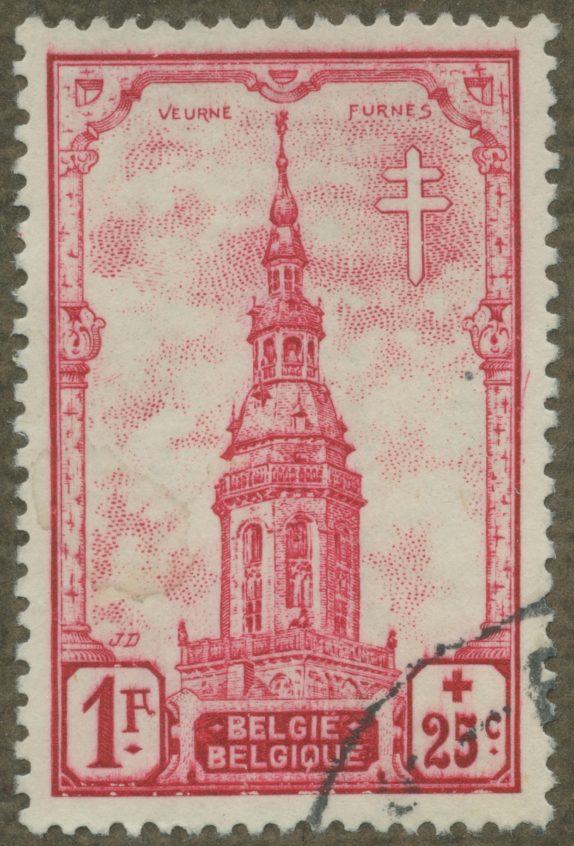 Frimärke från Belgien, 1939. Motiv av katedralen i Furnes med Beffroin, vakttorn. "Tuberkulos serie".