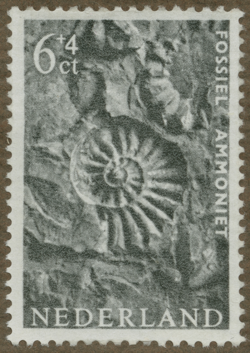 Frimärke från Nederländerna, 1962. Motiv av fossilt avtryck av snäcka. "Ca 140-175 millioner år gammalt. S.k. Ammonite spinatus". "från Zoologiska museum, Amsterdam. Museum seir".