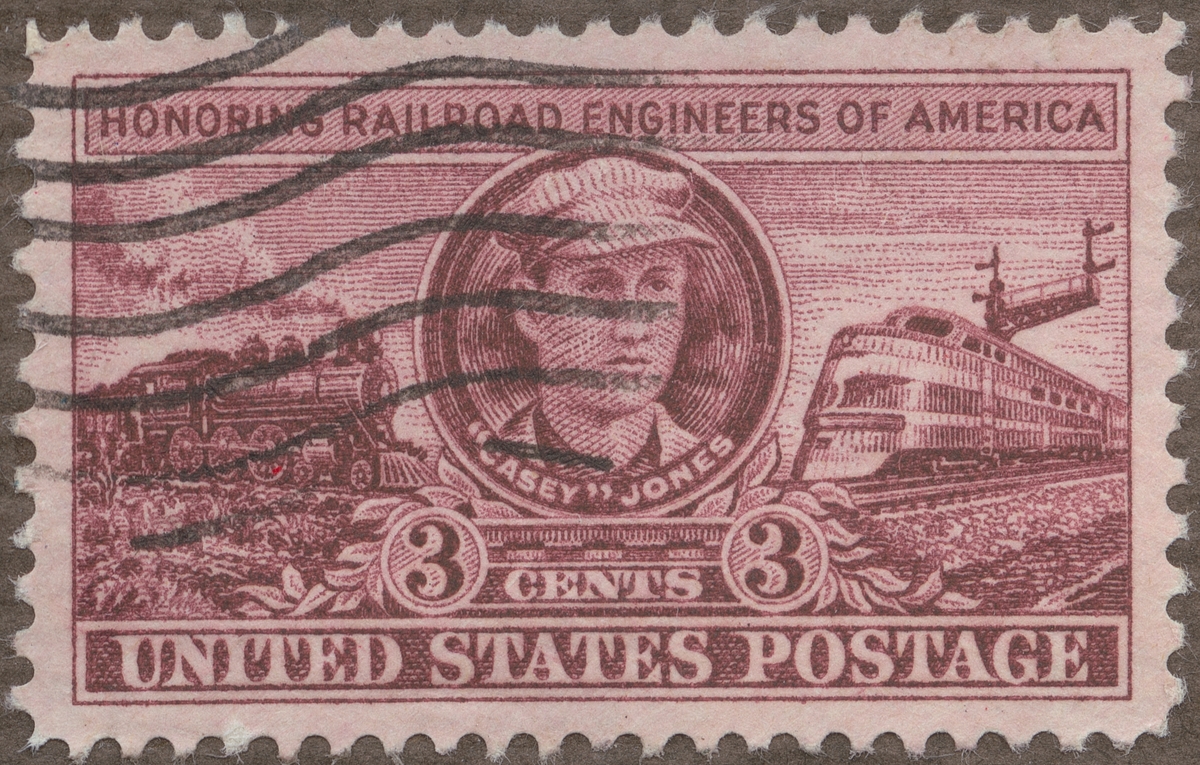 Frimärken ur Gösta Bodmans filatelistiska motivsamling, påbörjad 1950. Frimärke från U.S.A., 1950. Motiv av Ånglok och Diesel-lok. "-Heder åt amerikanska järnvägsingenjörerna- (center) John Luther "Casey" Jones: 1864-1900. Illinois Central banans hjältelokförare, dödad 1900 i tågmanöver emellan Chicago och New Orleans. Alla blev räddade utom Jones. Hjälten i skillingavisan: "Casey Jones"."