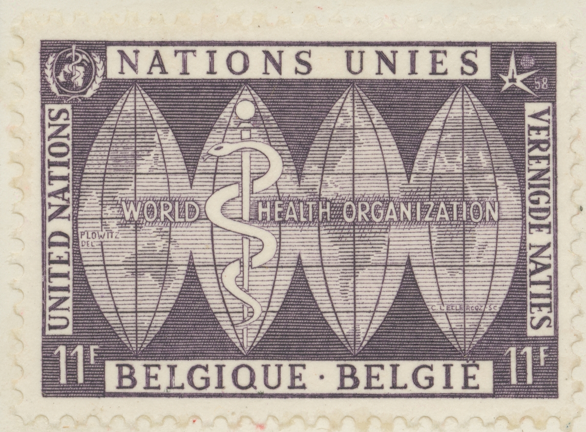 Frimärke från Belgien, 1958. Motiv av fyrdelat jordklot och läkarestav. "Worls Health Organisation, Brysselutställningen 1958, F. N. -serie".