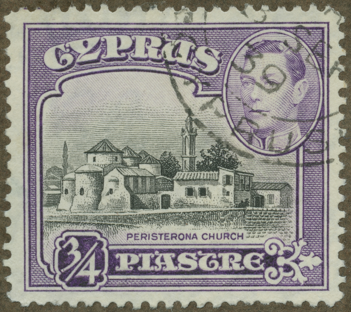 Frimärke från Cypern, 1938. Motiv av Peristerona Kyrkan. Till höger: Kung George VI.