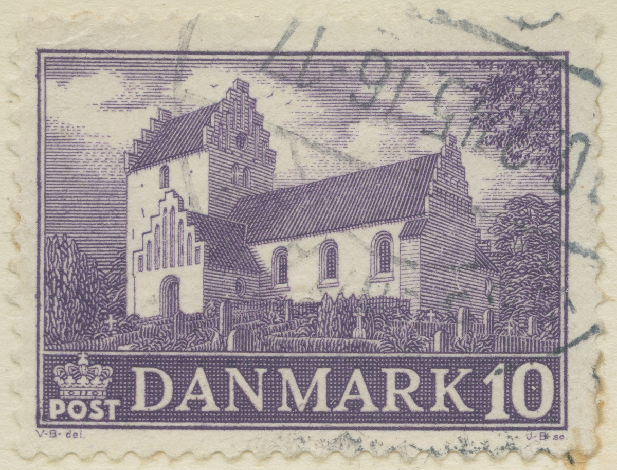 Frimärke från Danmark, 1944. Motiv av Ejby Kyrka på Själland.