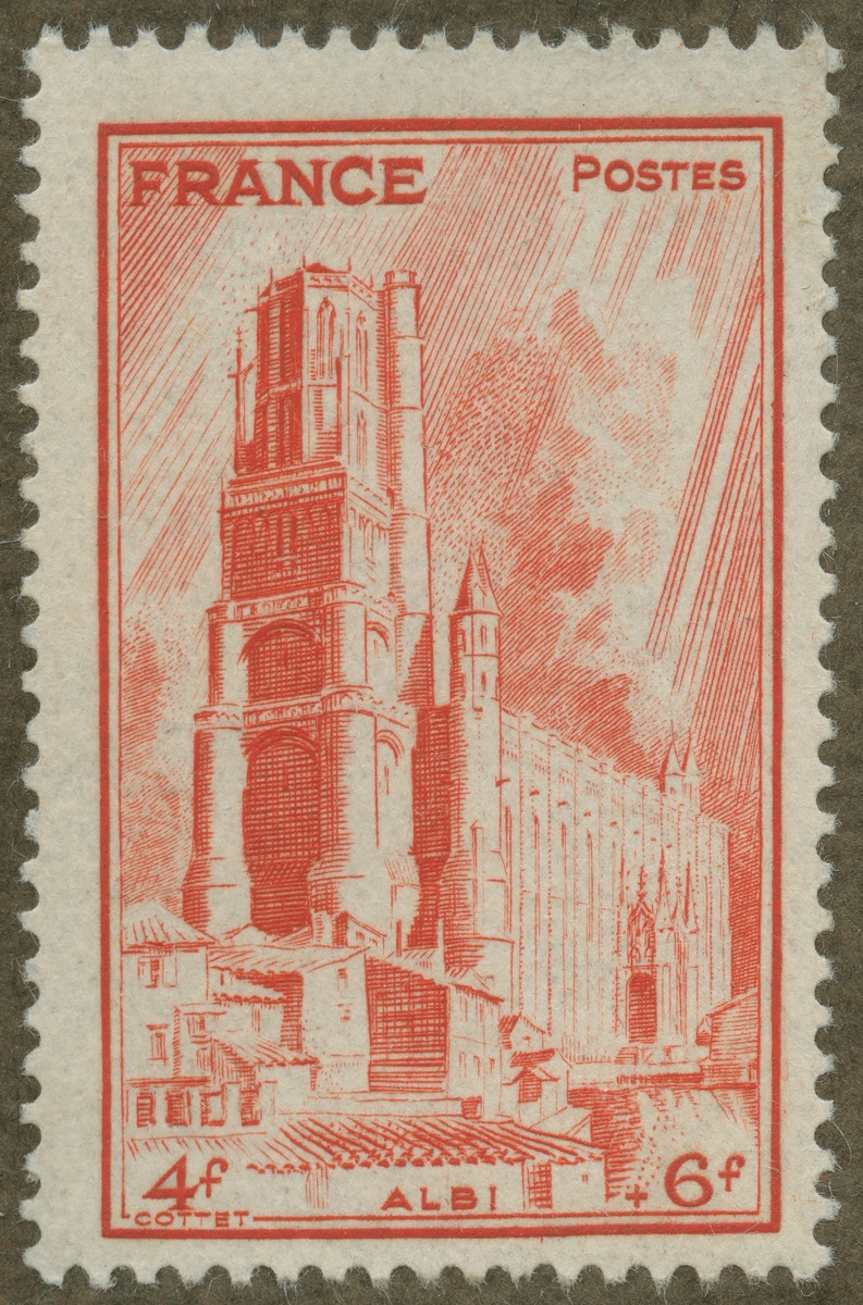 Frimärke från Frankrike, 1944. Motiv av katedralen i Albi. "Serie: Franska Katedraler".