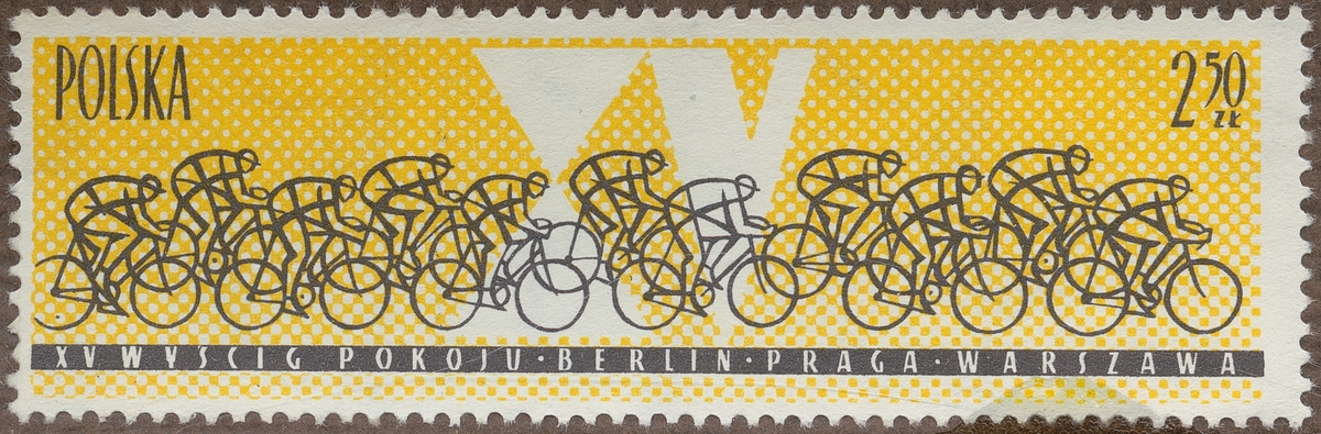 Frimärken ur Gösta Bodmans filatelistiska motivsamling, påbörjad 1950. Frimärke från Polen, 1962. Motiv av "Tävlings fältet" : "15:nde internationella cykeltävling: Berlin - Prag - Warshawa"
