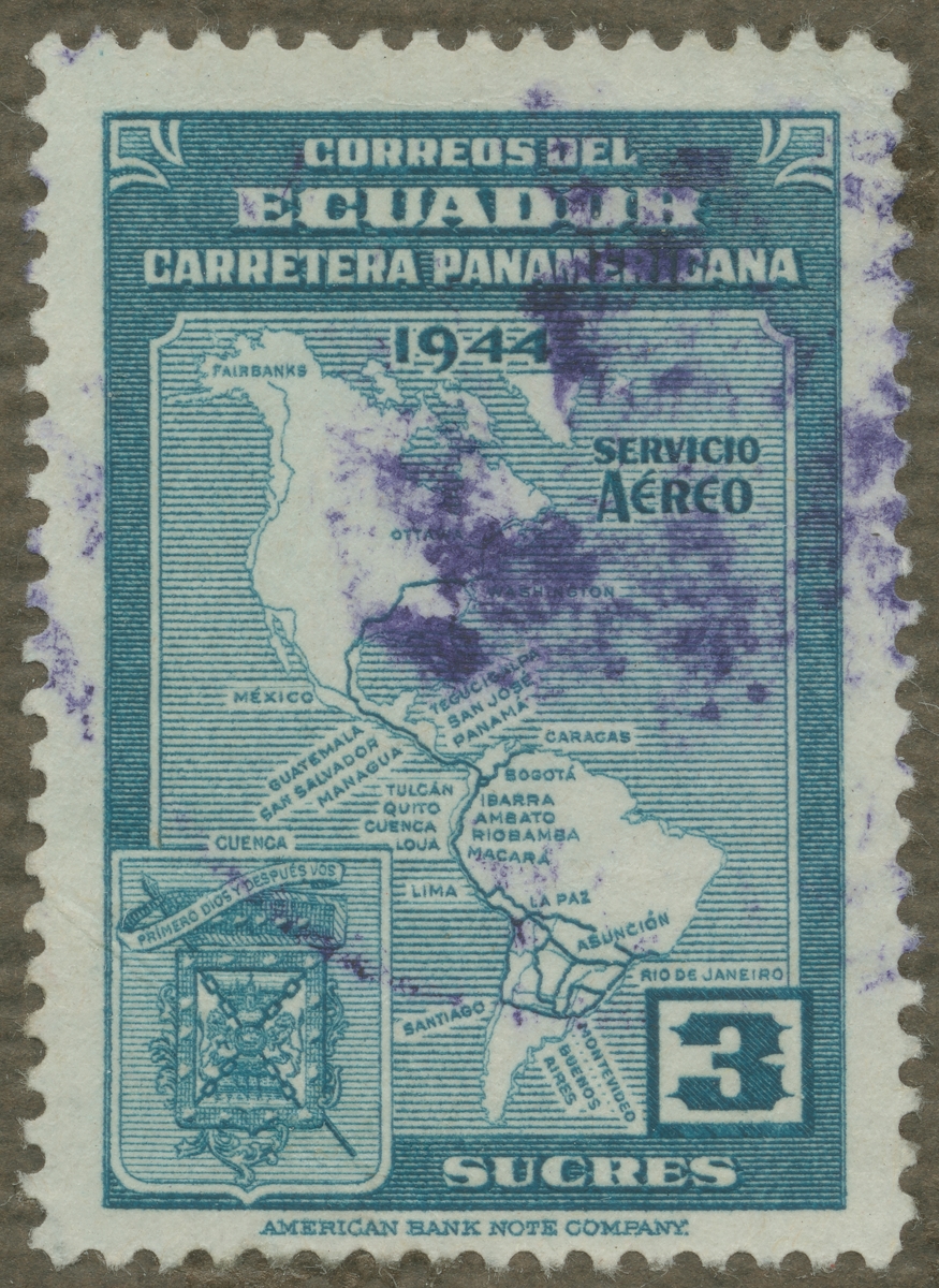 Frimärke från Ecuador, 1946. Motiv av karta över Sydamerika med Riksvägen: "Pan-American Highway" och Cuencas vapen.