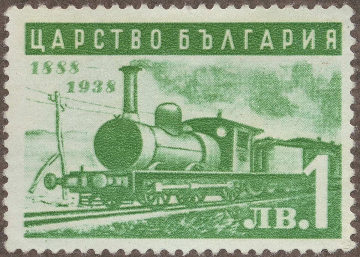 Frimärken ur Gösta Bodmans filatelistiska motivsamling, påbörjad 1950. Frimärke från Bulgarien, 1938. Motiv av Äldre bulgariskt lokomotiv "50-årsminne av Bulgariens järnvägar 1888-1938"