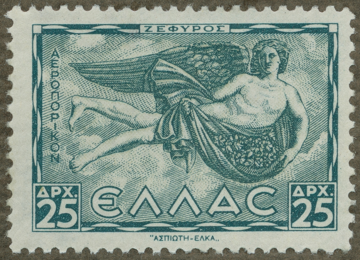 Frimärke ur Gösta Bodmans filatelistiska motivsamling, påbörjad 1950. Frimärke från Grekland, 1942. Motiv av Västanvinden "Zephyros" Flygmärke"