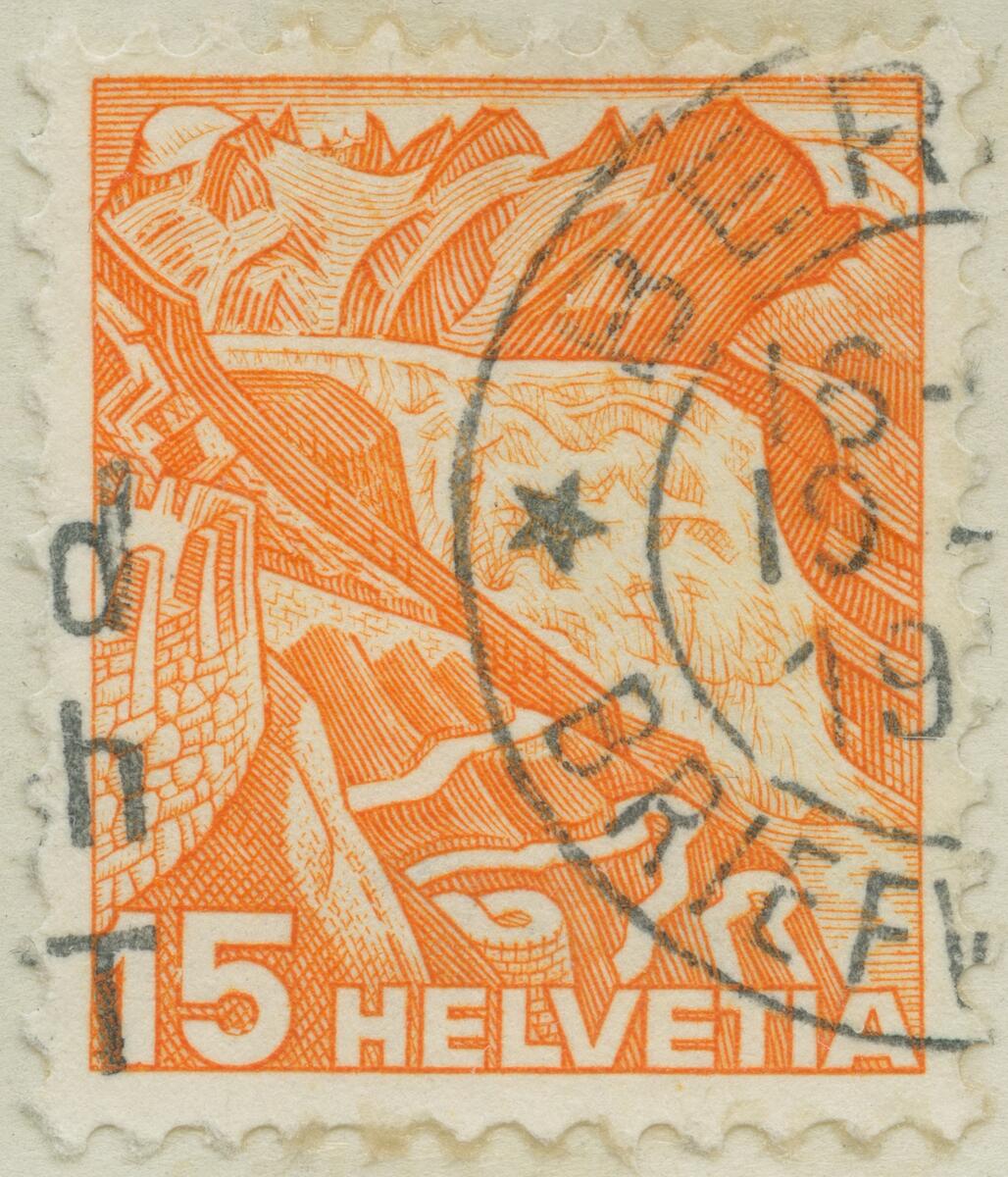 Frimärke ur Gösta Bodmans filatelistiska motivsamling, påbörjad 1950. Frimärke från Schweiz, 1936. Motiv av Rhone- Glaciären