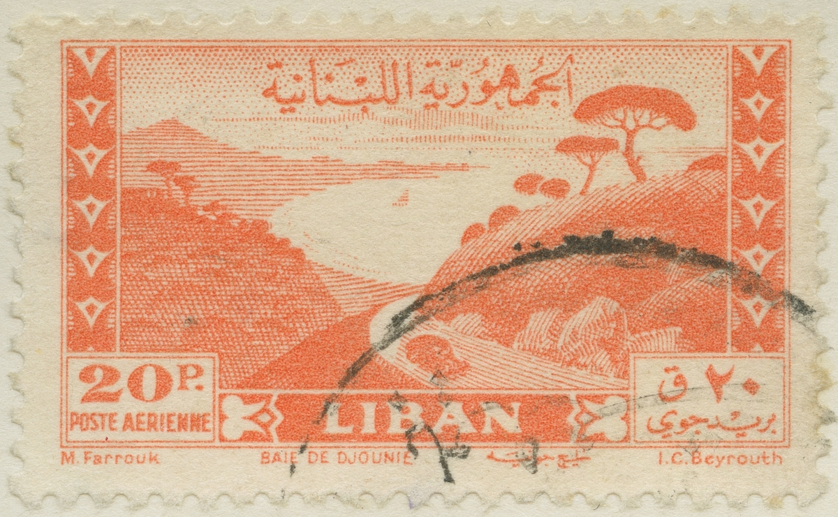 Frimärke ur Gösta Bodmans filatelistiska motivsamling, påbörjad 1950. Frimärke från Libanon, 1947. Motiv av Utsikt mot Djounie bukten
