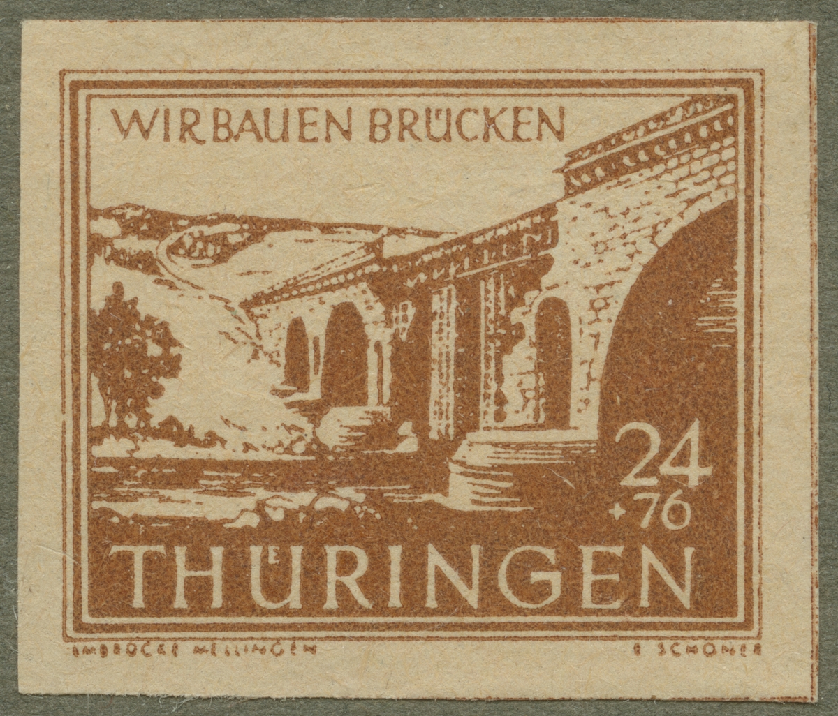 Frimärke från Tyskland, 1946. Motiv av Ilm-bron vid Mellingen. Reparation 1946, Thüringen.
