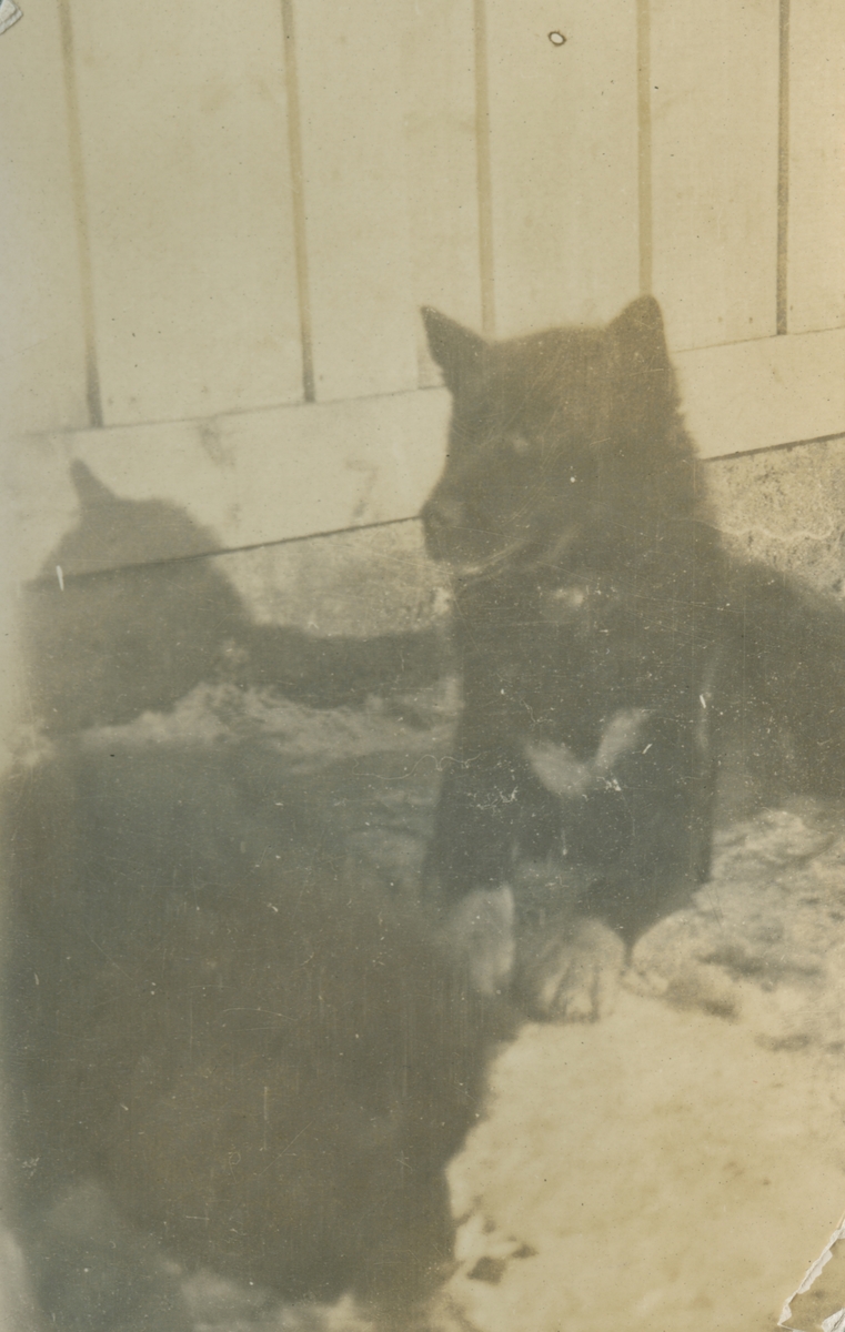 Fotografi från expedition till Spetsbergen. Motiv av två hundar som vilar framför hus.