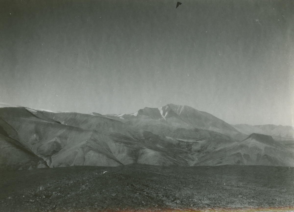 Fotografi från expedition till Östgrönland 1929. Dansk-svensk expedition under ledning av Lauge Koch. Svenska deltagare: Oscar Kulling och Helge Backlund. Vy över hav berg och isberg.
