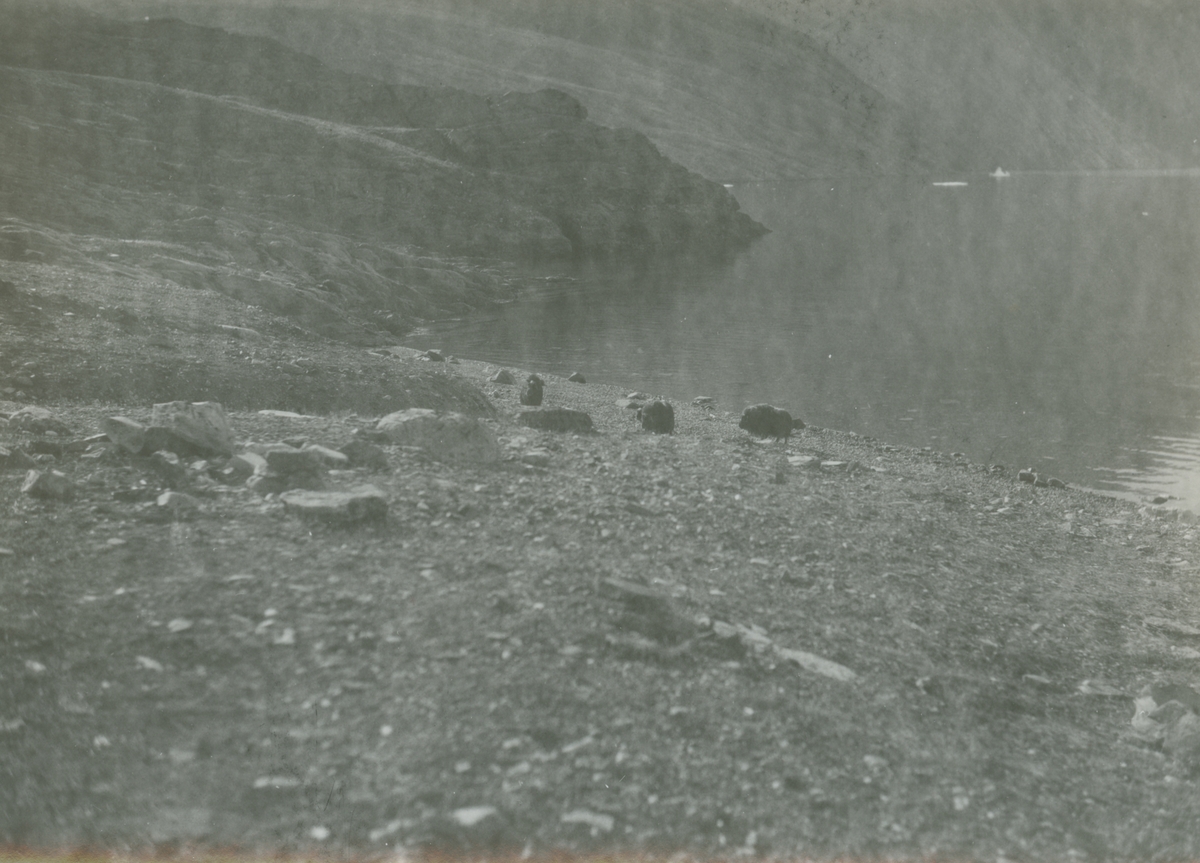 Fotografi från expedition till Östgrönland 1929. Dansk-svensk expedition under ledning av Lauge Koch. Svenska deltagare: Oscar Kulling och Helge Backlund. Motiv av myskoxar vid vatten i bergslandskap.