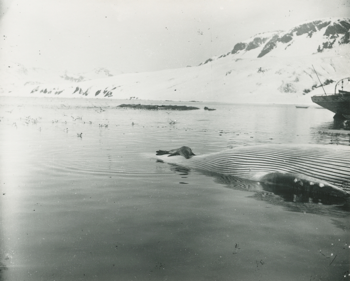 Bild från expedition i Antarktisområdet. Motiv av död val i vattnet. På valen ligger en säl och vilar sig.