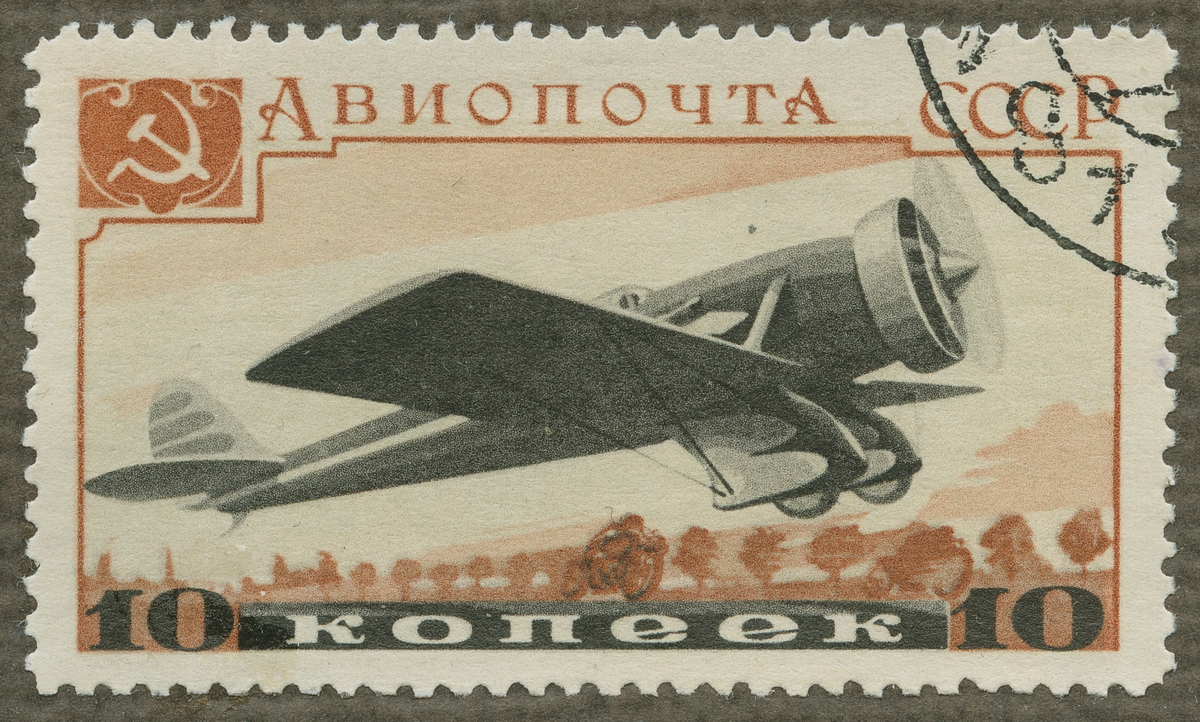 Frimärke från Ryssland, 1937. Motiv av Monoplan för luftpost "Flygplans Serie:" -Minne om Luftfarts Utställningen i Moskwa d, 15-20 november 1937-