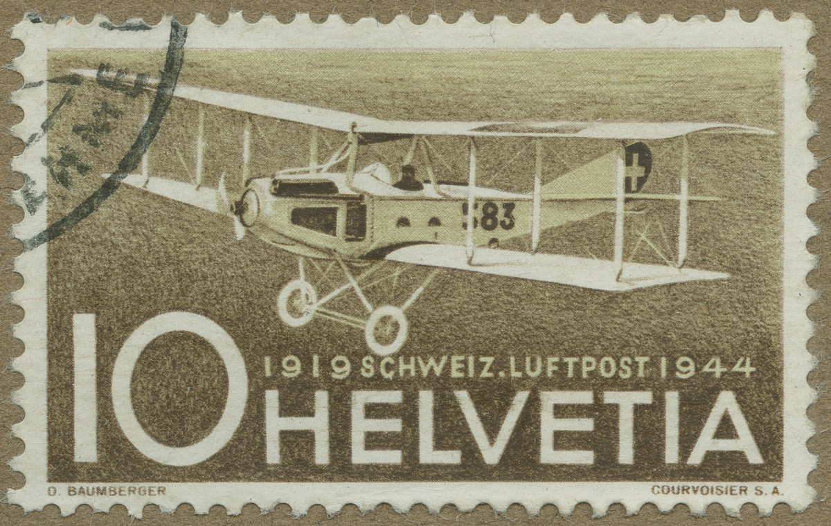 Frimärke från Schweiz, 1944. Motiv av Schweiziskt postförande biplan Typ: DH3 Haefeli. 25-årsminne av den första schweiziska regelmässiga luftpostlinje. 1919-1944.
