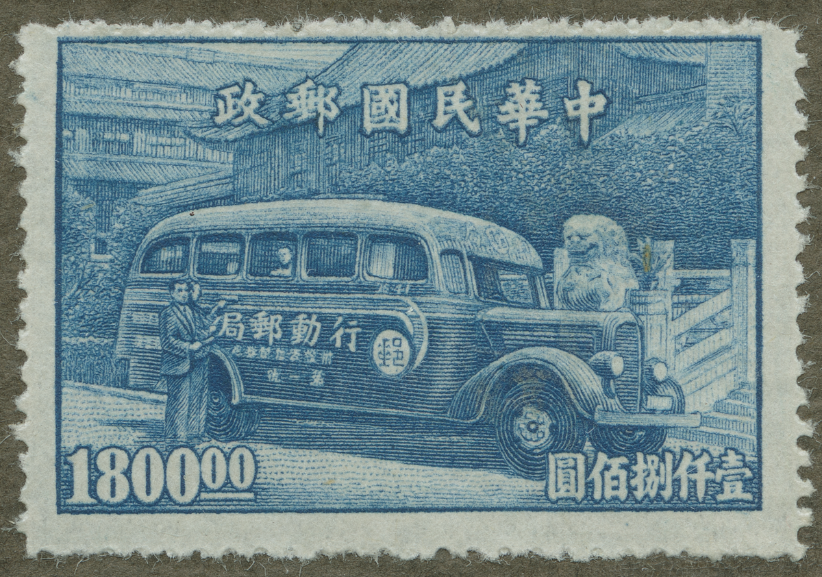 Frimärke från Kina, 1947. Motiv av Kinesisk postbuss: ambulerande postkontor.