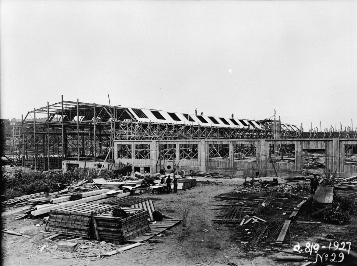 Byggherre: Bygnadaktiebolaget Contractor, Stockholm. General Motors Nordiska AB:s första fabriksbyggnad i Sverige. Arbetsbild. Hammarbyhamnen 1927.