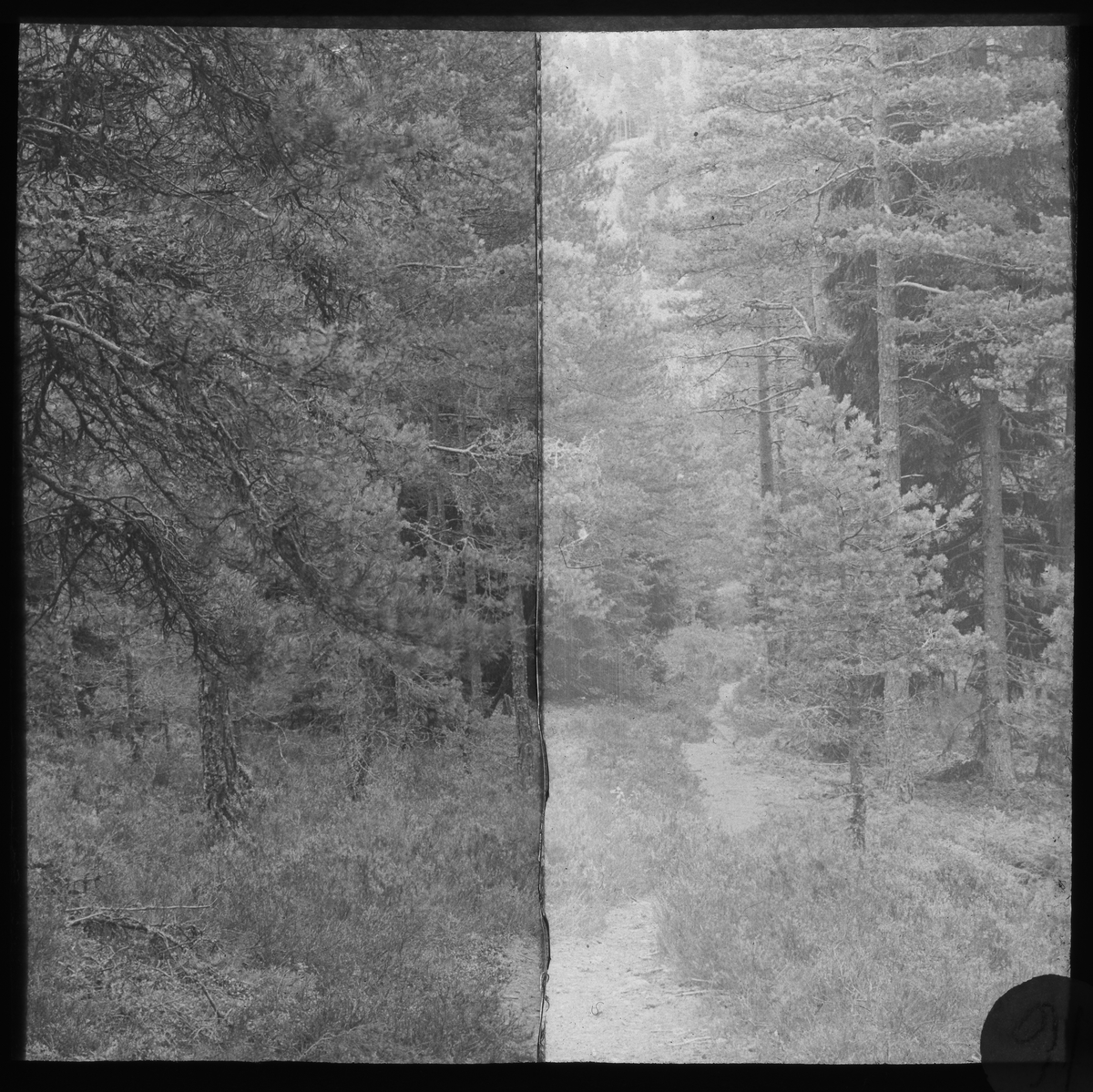 Skioptikonbild från institutionen för fotografi vid Kungliga Tekniska Högskolan. Använd av professor Helmer Bäckström som föreläsningsmaterial. Bäckström var Sveriges första professor i fotografi vid Kungliga Tekniska Högskolan 1948-58. Motiv föreställande "Skog". Undervisningsbild som troligen visar på olika exponering.