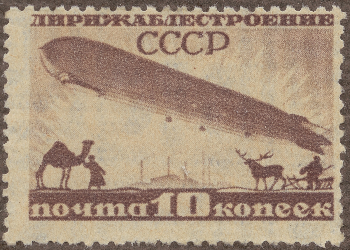 Frimärke från Ryssland, 1931. Motiv av Rysk Zeppelinare Kamel Rensläde "Propagandamärke: -Serie för byggande av styrbara luftballonger.-"