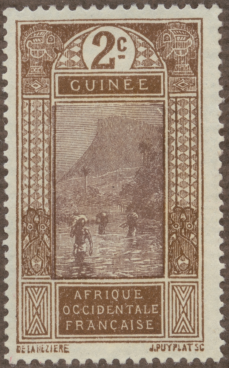 Frimärke ur Gösta Bodmans filatelistiska motivsamling, påbörjad 1950. Frimärke från Guinea, 1913. Motiv av Bärare passera ett vadställe i en flod i Afrika