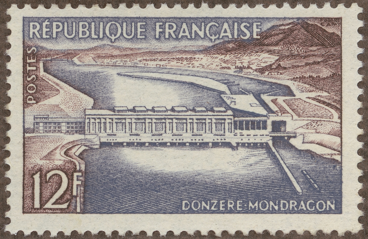 Frimärke ur Gösta Bodmans filatelistiska motivsamling, påbörjad 1950. Frimärke från Frankrike, 1956. Motiv av Kraftverksdammen vid Donzere-Mondragon