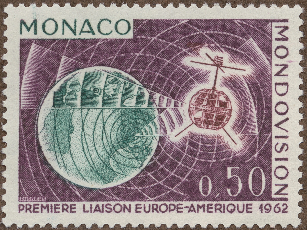 Frimärke ur Gösta Bodmans filatelistiska motivsamling, påbörjad 1950. Frimärke från Monaco, 1962. Motiv av Första Television förbindelse Europa-America: 1962 per Tel-Star.