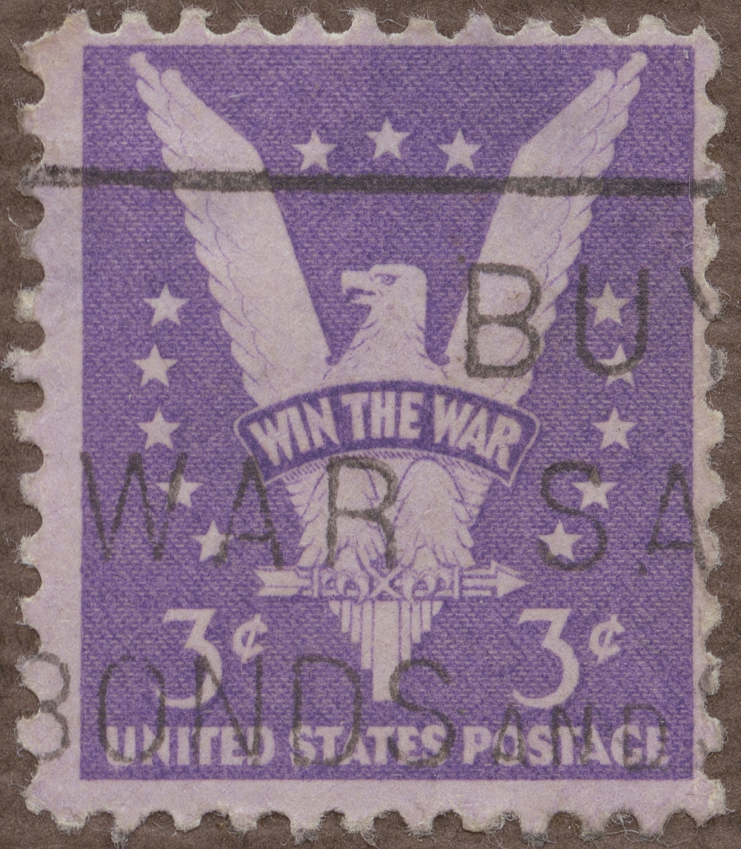 Frimärke från U.S.A., 1942. Motiv av Stiliserad amerikansk örn som symbol för krigets vinnande: och flygpost "Win the War" (världskrig II).-