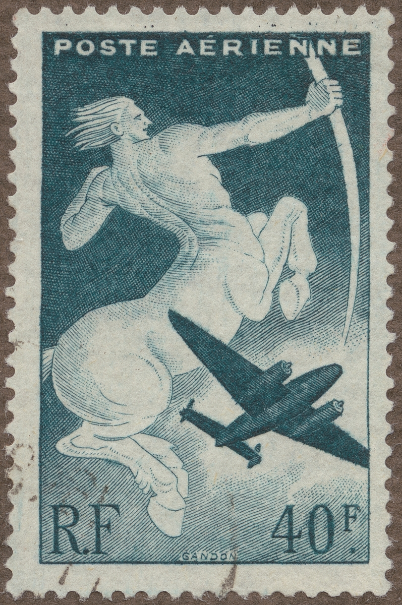 Frimärke från Frankrike, 1946. Motiv av Tremotorigt monoplan jämte Centaur Symbol för flygpost