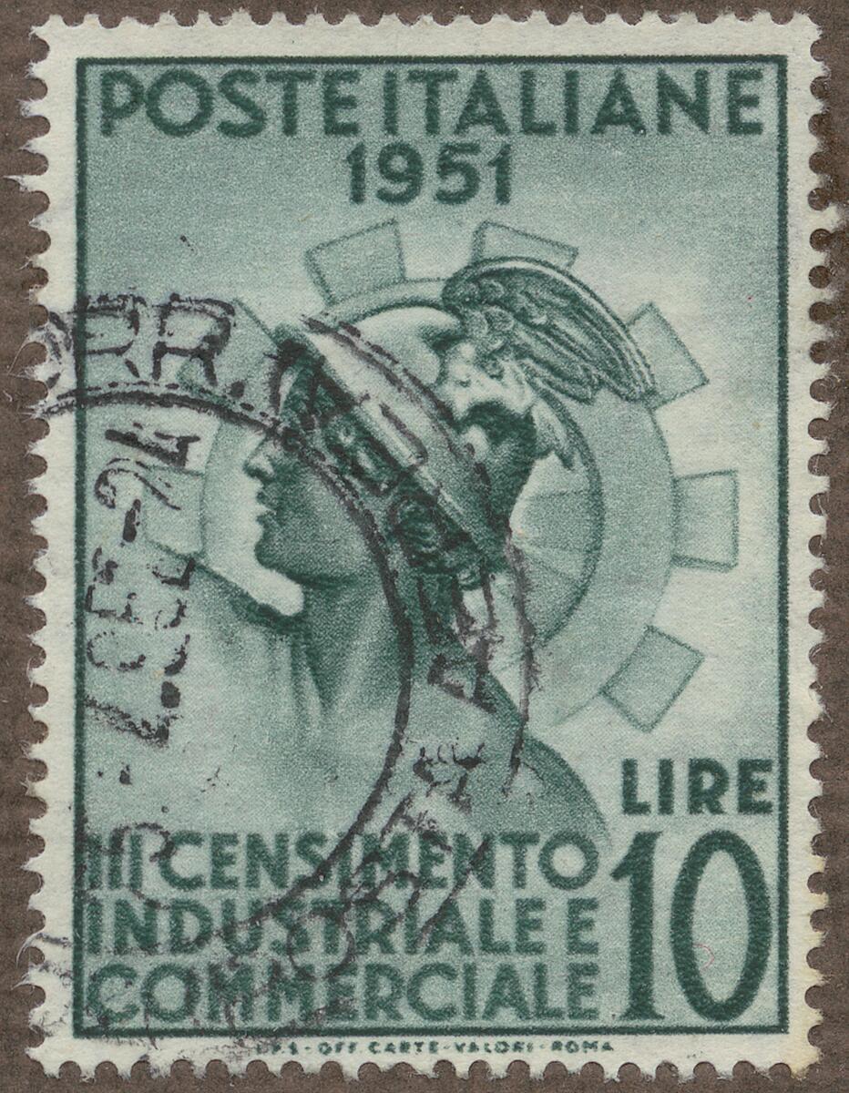 Frimärke från Italien, 1951. Motiv av Merkuriushuvud med ett kugghjul i bakgrunden 3-dje Industri- och handelskongressen