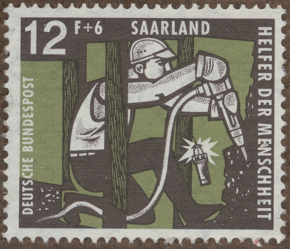 Frimärke från Saarland Väst Tyskland, 1957. Motiv av Borrarbete i gruva