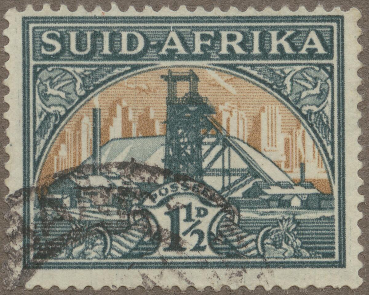 Frimärke från Sydafrika, 1936. Motiv av Gruvtorn i guldgruva utanför staden Johannesburg (i bakgrunden): Johannesburgs silhouette