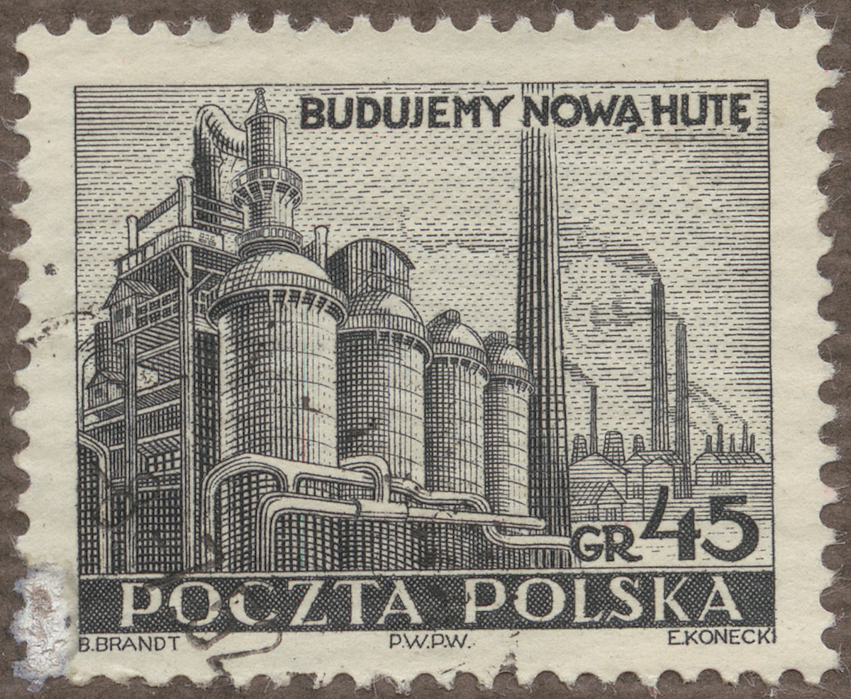 Frimärke från Polen, 1951. Motiv av Järnverksanläggning i Nowa Hute, Polen. -Till invigningsdagen av Nya "Lenin järnverket"