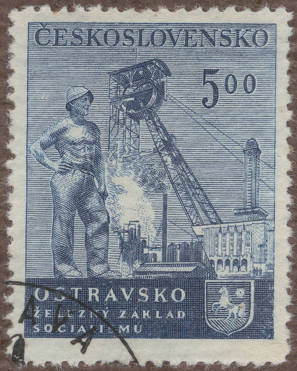 Frimärke från Tjeckoslovakien, 1950. Motiv av Gruvlave Uppfordringsverk -Propaganda för andra Kongressen av "Unionen för tjeckoslovakisk-rysk vänskap"-