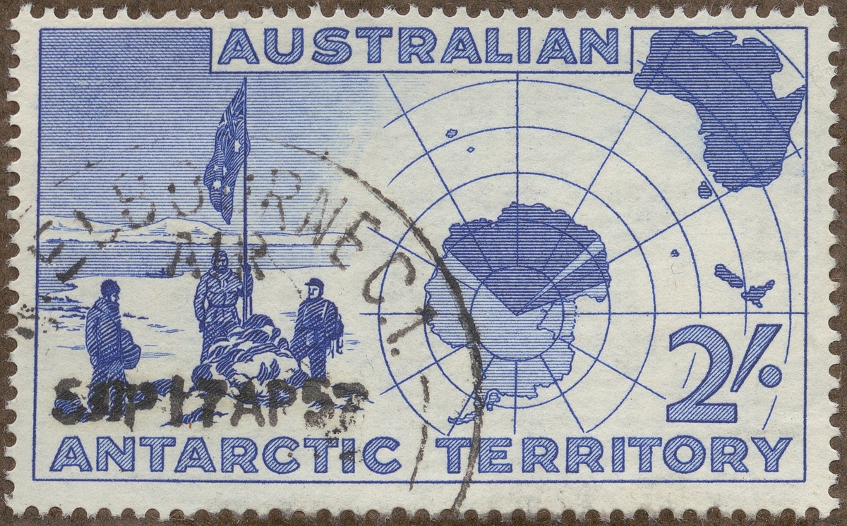 Frimärke från Australien, 1957. Motiv av Australiensiska polarupptäcktsresenärer -Karta över Australiens Antarctiska Territorium.-