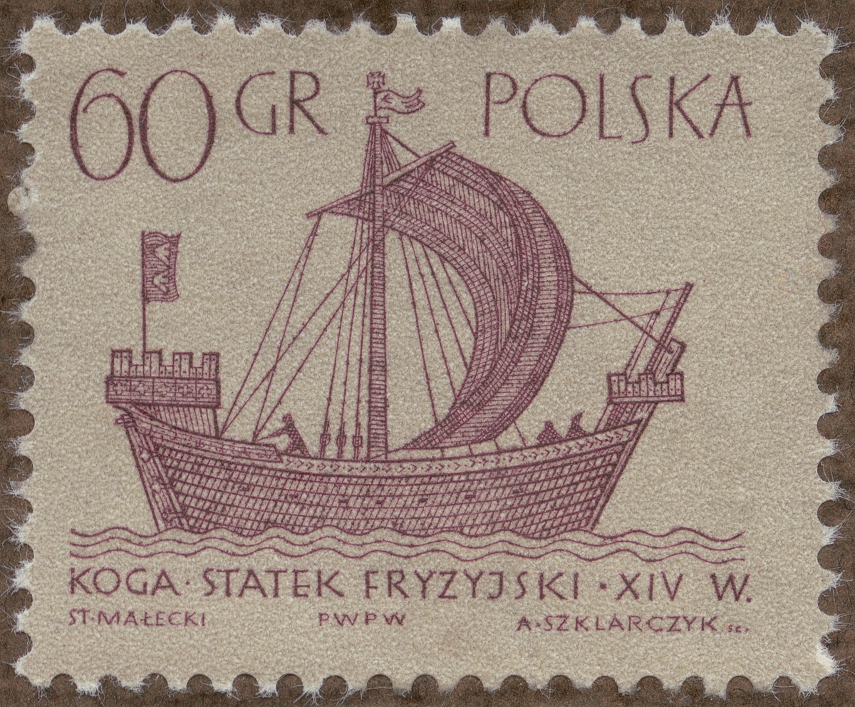 Frimärke från Polen, 1963. Motiv av Frisisk "kogge" (Holland) från 1300-talet. "Serie: gamla skepp."