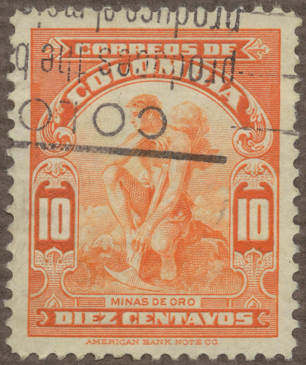Frimärke från Colombia, 1935. Motiv av Guldgrävning i Colombia, Sydamerika.