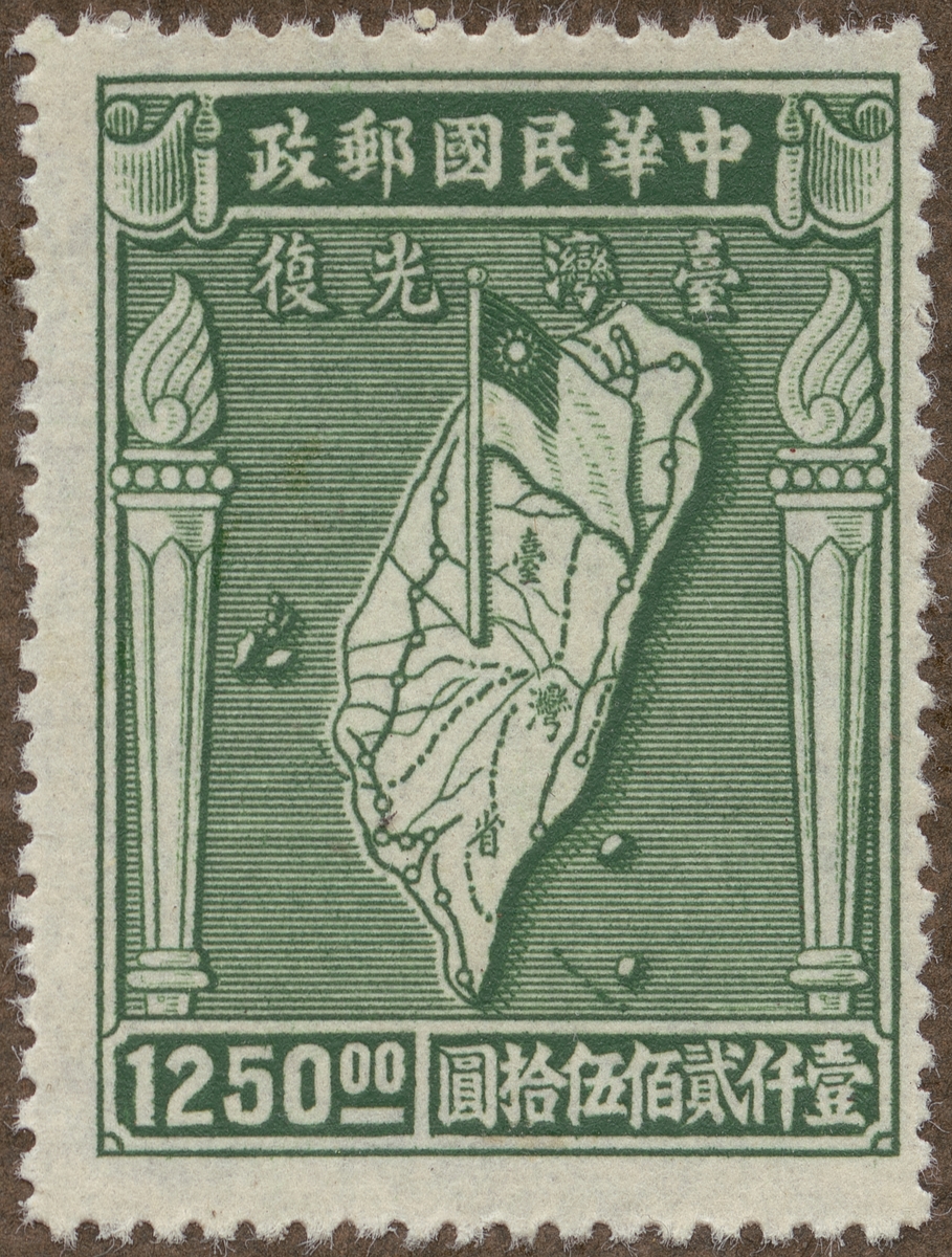 Frimärke från Formosa, 1958. Motiv av Flagga på Formosas karta
